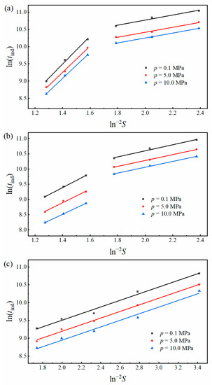 The plot of ln(tind) versus ln−2S for RBV (Form II) in water at different supersaturations and pressures: (a) 283.15 K, (b) 293.15 K, (c) 303.15 K.