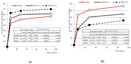 The influence of different amounts of NC and MSS on the mechanical properties of cement paste, and the test results are presented in Figure 2. With the addition of 3% by weight and 6% by weight of NC, the compressive resistance of cement paste was improved in relation to the control sample. Compression resistances with 3% NC increased by 14.5% and 2.4% at 7, 28 and 90 days, respectively. Similarly, compression resistances of 6% increased by 6.2% and 5% at 7, 28 and 90 days, respectively.
