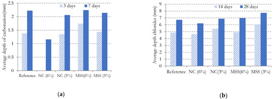 3.2. Effect of NC and MSS on Carbonation and Chlorides