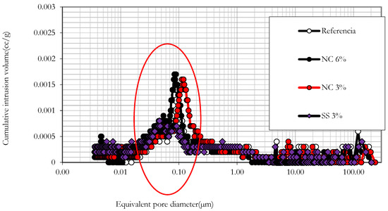 Figure 4 shows for each mortar the increase in mercury intrusion volume based on the equivalent pore diameter. Highlighting, the shift to the left of the curve black dots, belonging to the NC (6%), which implies a refinement of pores that transform into small capillary pores and that would explain the least detected amount of small pores. The largest critical diameter corresponds to the SS (6%), followed by mortars containing NC (3%) and, finally, by the SS (3%) NC (6%). As mentioned, this reduction in critical diameter entails a general refinement in the porous structure that can be seen by the shift to the left of the different curves.