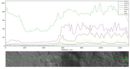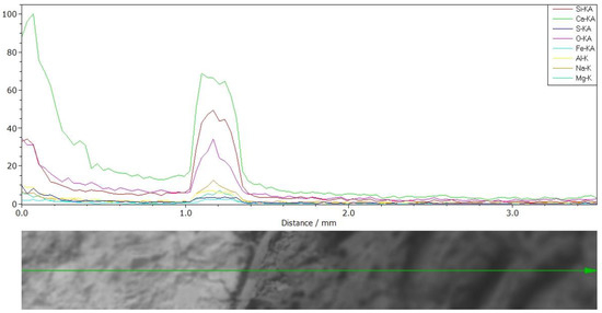 The Figure 5 shows the fissured area with sodium silicate (6%), and the comparative analysis of the elemental composition by dispersed energy. An area with a higher concentration of Ca, Si and Na atoms can be observed. The presence of Na in the cement zone is very significant, since this element is practically absent in the chemical composition of cement [18], as we have seen in Section 2.1.