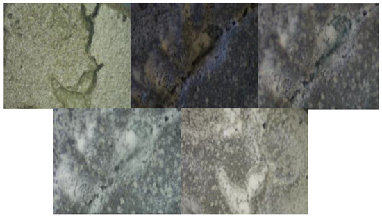 Visual inspection of the fissure is also performed through an optical microscope. This consists of sweeping the fissure taking photos so that there is overlap between the previous and subsequent ones for subsequent reconstruction of the fissure. Through Figure 7, the follow-up over time is observed for 79 days of a cracked cement paste with 6% MSS, where the sewn of it is observed due to the presence of new crystals, this coincides with the results obtained by SEM. The lack of cohesion or sewn that is shown in the fissure, reduces as hydration progresses, since much of these cracks are filled with new hydration products improving in this way, the compactness of the internal microstructure by densification of it. At the age of 28 days it was almost cured, the new rehydration and self-healing products between the fissures were clearly observed after 12 days, and after 79 days of rehydration, as shown in the figure the fissure is almost completely sealed (pictured right below). MSS reacts with calcium hydroxide, a product of cement hydration, and produces a hydrated calcium-silica (C-S-H) of gel-a natural bonding material with concrete. The C-S-H gel (x.(CaO·SiO2)·H2O), partially fills the fissure, and allows some recovery of force.
