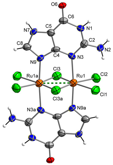 The crystal structure of 1 was obtained by single-crystal X-ray diffraction. A CSD survey revealed that 1 displays the first reported crystal structure based on a dinuclear Ru(III) compound containing guanine. Compound 1 crystallizes in the monoclinic system with space group C2/c (Table 1). The crystal structure of 1 is made up of neutral [{Ru(µ-Cl)(µ-gua)}2Cl4] units and H2O molecules. The asymmetric unit of 1 consists of half a [{Ru(µ-Cl)(µ-gua)}2Cl4] complex and one H2O molecule (Figure 1).