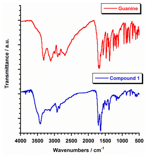 FT-IR spectra for guanine (red) and compound 1 (blue).