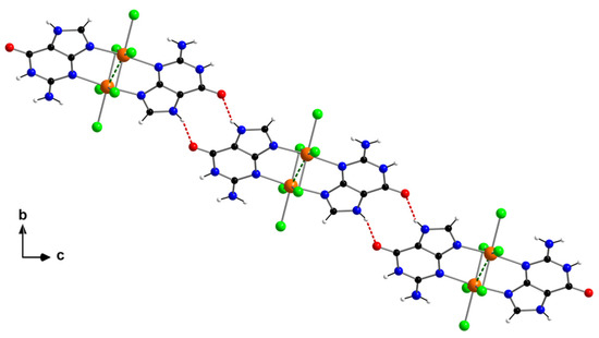 In this dinuclear complex, each Ru(III) ion is linked to four chloride ions and two nitrogen atoms (these are N3 and N9) from two guanine molecules in an almost regular Oh geometry. The two Ru(III) ions are connected to each other through two guanine molecules and two chloro-bridges (Figure 1). A very short intramolecular Ru···Ru distance [Ru(1)···Ru(1a) = 2.644 Å, (a) = −x−1/2, −y + 1/2, −z−2] indicates the formation of a metal–metal bond (dashed line in Figure 1). The average values of the Ru–Cl [2.318(1) Å] and Ru–N [2.103(1) Å] bond lengths are in agreement with those values published for previously reported Ru(III) systems with a similar metal environment [17,25].