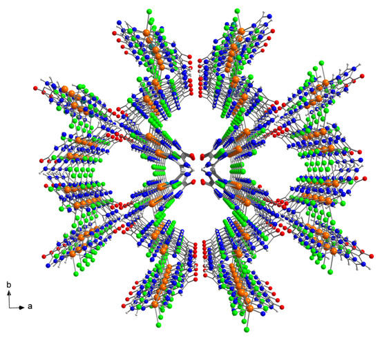 View along the crystallographic c axis of a fragment of the crystal packing of 1. Water molecules have been omitted for clarity.