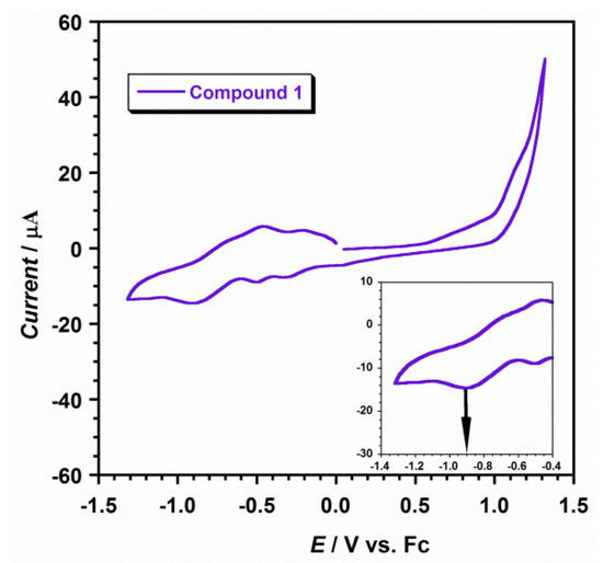 The study of the electrochemical properties of compound 1 was performed employing cyclic voltammetry (CV) in N,N’-dimethylformamide (DMF), containing 0.1 M [NBu4][PF6], in the range of potential values of +1.5 and −1.5 V and at 20 °C. The CV curve for 1 is shown in Figure 7.