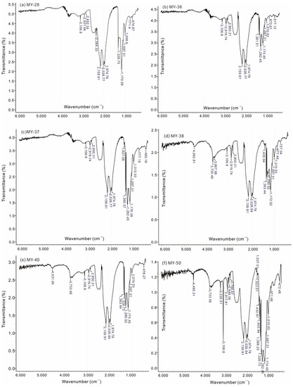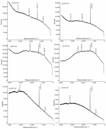 The Raman spectrum peaks of brown diamond from the Mengyin deposit are shown in Table S5 and Figure 6. Diamond with a perfect lattice commonly has a characteristic Raman peak of 1332 cm−1 [50]. The intrinsic peaks of the brown diamond from the Mengyin deposit generally drift to the low wavenumber, and present a small Raman spectrum range from 1326.82 to 1328.19 cm−1. In this study, we found that samples MY-28, MY-35, MY-36-1, MY-38, and MY-40 had some regular secondary peaks, such as 794 cm−1, 2084 cm−1, and 3120 cm−1.