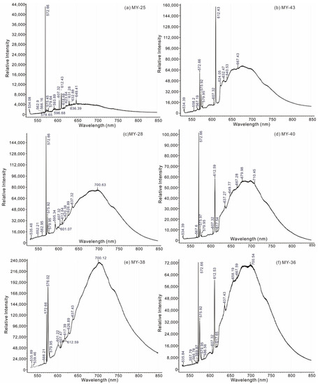 Moreover, samples MY-25 and MY-36-1 have obviously characteristic peaks at 617 (618) nm. Samples MY-28 and MY-38 exhibit a characteristic peak of 626.89 nm. The strong emission peaks of 572.66 nm and 612.5 nm are observed in all studied samples.
