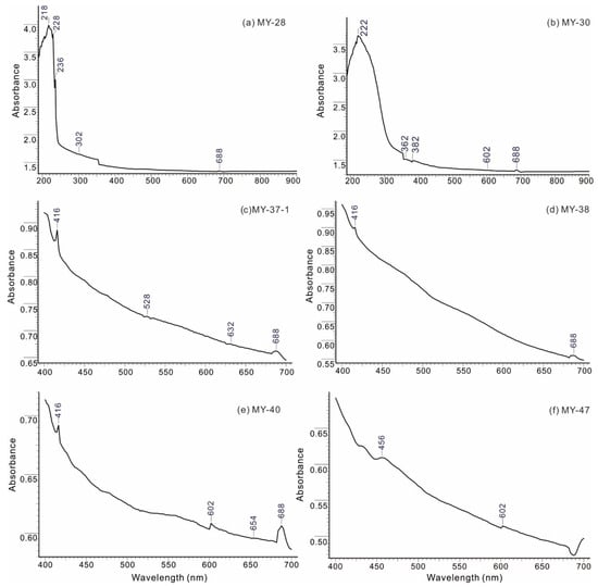 The UV-Vis absorption spectrum features of brown diamond from the Mengyin deposit are shown in Table S6 and Figure 7. There are obvious three absorption peaks at 416 nm, 602 (or 600) nm, and 688 (or 690) nm in the visible absorption spectra. Moreover, the studied samples with the characteristic peak of 416 nm in the visible absorption spectra are all IaAB type, and most of them are yellowish brown in color.