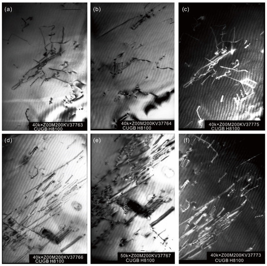 The TEM test was conducted in the Geoscience Test Center of China University of Geosciences (Beijing), China, and the test instrument is an lky-AB ion etching sample low-temperature thinning instrument (Shenyang, China). A representative sample MY-38 (yellowish brown in color) was polished twice to 0.2 mm, and a disc with a diameter of about 3 mm was cut and perforated by argon ion bombardment for 95 h. The edge of the hole is thinned to a thickness that the electron beam can penetrate for electron microscope observation and photography. The H-8100 electron microscope is made by Hitachi Limited (Tokyo, Japan), and the working accelerating voltage is 200 kV. The instrument is equipped with a Philp EDAX-4 X-ray spectrometer (EDS), Amsterdam, Netherlands, whose detector has an ultra-thin window and can identify all elements from boron (atomic number 5) to uranium (atomic number 92). At the same time of direct observation of TEM samples, the micro-area composition analysis test of inclusion binding EDS was carried out. Additionally, the weak beam dark field technology of transmission electron microscope is used to take pictures, which greatly improves the resolution.