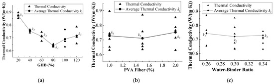 - The content of GHB has a significant effect on the compressive and split tensile strengths and thermal conductivity, the effect of water–cement ratio on split tensile strength is more significant. The PVA content has little effect on the strength and thermal conductivity of GPCC. The optimal ratio was determined as 40% GHB, 1.5% PVA fiber, and 0.26 water-binder ratio.