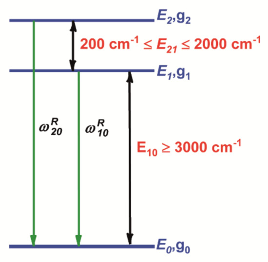 FIR technique uses the ratio between the intensities of the emissions coming from two TCL to characterize a temperature sensor in the following way [9]. Consider the luminescence of two TCL, having E1 and E2 energies, to a final level with energy E0 (see Figure 1) being I20 and I10 their respective integrated intensities. By describing the population of both levels in thermal equilibrium using Boltzmann’s distribution, we can define a thermometric parameter ∆ as [9]: