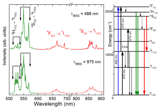 Up-conversion luminescence experiments presented in this work were performed in the temperature range from RT to 525 K in a tube-shaped electric furnace with the sample placed in its centre. The heating rate was 1 K/min to maintain thermal stability in the sample. The furnace temperature was monitored with a K-type thermocouple positioned close to the sample and connected to a voltmeter Fluke Calibrator 714 (Fluke Calibration, Everett, WA, USA). Erbium up-converted luminescence was excited using a tunable Ti-sapphire cw laser Spectra Physics 3900S (Fluke Calibration, Everett, WA, USA) pumped by a 532 nm diode laser (Spectra Physics Millennia Prime Laser 15SJSPG). The excitation wavelength was selected to be 975 nm. To avoid overheating the sample, the laser power was kept as low as possible. Through a lens system at the furnace exit, the up-converted green emissions were collimated and then focused on an optical fiber coupled to a 0.3 m focal length single grating spectrometer (Andor Shamrock 303i). The light was detected by a Peltier cooled silicon CCD camera (Andor Newton DU490A-1.7) with a resolution of about 0.7 nm (about 25 cm−1 in the green region) and an integration time of 10 s. All spectra were corrected for the spectral response of the equipment. Conventional room temperature luminescence measurements were performed using a 488–490 nm laser diode as an excitation source and emission signal was detected with the experimental set-up described elsewhere [28].