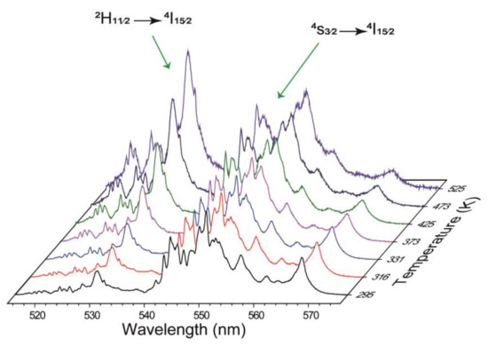 Measuring temperature accurately and reliably is very important in several application areas, ranging from health care to industrial applications [1,2,3,4,5]. The working mechanism of optical temperature sensors is based on the temperature dependence of the material’s optical properties, which allows for the monitoring of temperature in certain locations such as in electrical power stations, refineries, and coal mines. These sensors can also be useful in building fire detection [6,7]. In addition to precision and reliability, other characteristics such as high sensitivity and resolution and fast response are also required when using these materials as temperature sensors [2]. Changes in optical properties and their dependence on temperature have been studied in different ways: the spectral position of emission and absorption lines, their intensity, bandwidths and decay time and even polarization [2]. Since the discussions in the 1970s of the possible application of the fluorescence intensity ratio (FIR) technique for temperature sensing[8], this technique is among the most widely used due to its excellent advantages in terms of sensitivity and stability [9]. The classical use of this technique requires the presence of thermally coupled levels (TCL), two nearby energy levels which are assumed to be in a state of thermal quasi-equilibrium [10], in which luminescence intensities are measured. The energy distance between these TCLs must be small enough to allow a redistribution of the population of thermal origin between the lower and higher energy levels, which is the origin of the FIR technique. However, at the same time there has to be a separation between levels large enough to solve the emission lines originating in each one of them. A typical value between 200 and 2000 cm−1 [11] is usually accepted as the energy gap between levels that allows the application of the FIR technique. Most of the trivalent lanthanide ions (Pr3+, Nd3+, Eu3+, Ho3+, Er3+, Tm3+) fulfil the above requirement and their introduction in small amounts into host materials of different types allows for the use of these materials as potential optical thermometers [12,13,14,15,16]. The narrow absorption and emission bands and the relatively long luminescence lifetimes commonly observed in trivalent lanthanide ions are the principal advantages of these materials compared to other organic materials and quantum dots. Furthermore, the specific properties of the various host materials make it possible to configure rare-earth doped systems providing a wide variety of additional advantages. For instance, we highlight the high resistance to blinking or photobleaching of some materials, allowing wide applications in forensic sciences, biomedicine (bioimaging, photo-dynamic therapy or laser heating), optical temperature and/or pressure sensors [15,16,17,18,19,20].