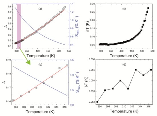 Experimental integrated intensity ratio, ∆, (a) in the whole temperature range and (b) in the physiological range of temperature (303 K–318 K), black squares, and relative sensitivity (SREL), blue lines of the La2.9Er0.1NbO7 powder samples obtained from the emission bands associated to the 2H11/2→ 4I15/2 and 4S3/2 → 4I15/2 transitions. A Boltzmann type curve was fitted to the experimental values of ∆ according to Equation (1) (red line). Temperature uncertainty, δT, computed by Equation (3) in the (c) whole temperature range as well as (d) within the physiological range of temperature.