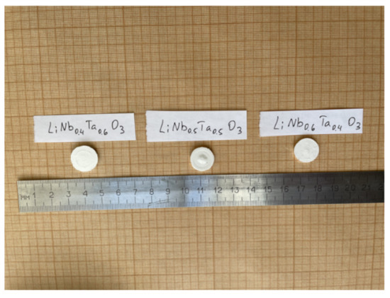 Samples of LiNbxTa1−xO3 ceramic solid solutions in the form of pellets up to 10 mm in diameter and 1 mm thick were prepared by standard ceramic technology by high-temperature solid-phase synthesis [12], Figure 1. Table 1 shows the structural characteristics of the crystal lattices of the samples under study.