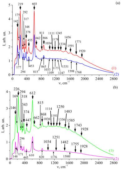 In [18,19], the manifestation of overtone bands in the Raman spectra of diamond and LiNbO3:Tb crystals was reported for the first time in the spectral range 1300–2700 cm−1. In the second-order Raman spectra studied earlier in a number of crystals [20,21,22,23], pairs of phonons with oppositely directed quasi-momenta, corresponding to the boundary or inner region of the Brillouin zone, appeared. Previously, in the second-order Raman spectra of a number of crystals, manifestations of phonon pairs were detected, which were interpreted as anomalies in the density of bound and free two-phonon states.