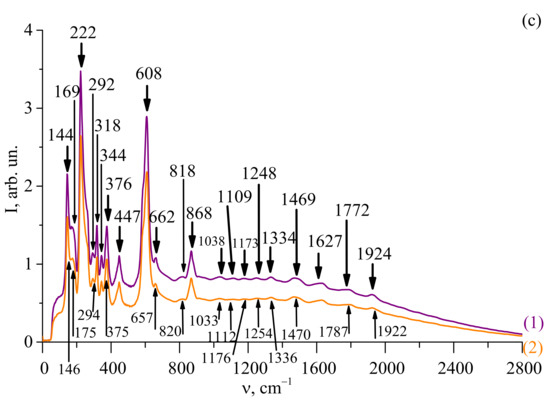 The setup for recording of Raman spectra at room temperature using a backscattering geometry with BWS465-785H spectrometer was presented in [18,19]. Raman spectra were excited by 785 nm cw semiconductor laser with a 200 mW power. Laser radiation was delivered to the sample surface using one of the channels of a two-wire optical fiber, and the Raman signal was delivered through the second channel to a selective light filter and then to the input of the spectrometer. We used a BWS465-785H spectrometer with a detection range of 50–2850 cm−1.