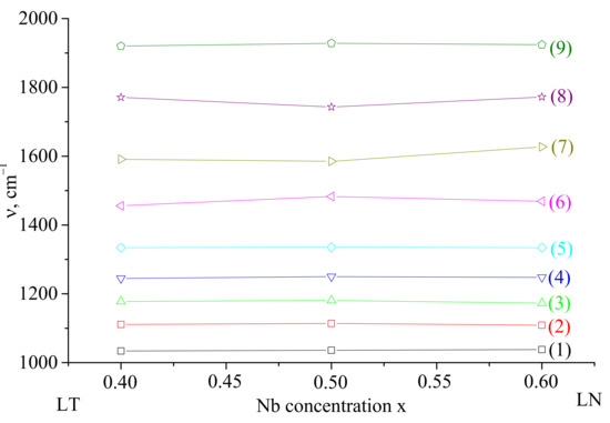 Dependence of second-order Raman lines frequency on the composition of LNT ceramic solid solutions. Lines (1–9) correspond to the frequencies of Raman lines marked in Figure 3a–c in the region of 1000–2000 cm−1: (1)-1034, (2)-1111, (3)-1178, (4)-1245, (5)-1334, (6)-1456, (7)-1591, (8)-1771 and (9)-1920 cm−1.