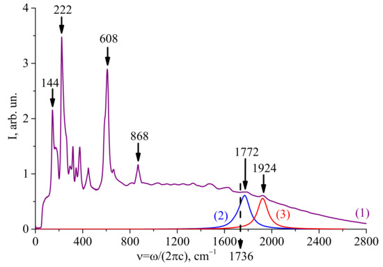 Let us consider, for definiteness, the overtone state of the fully symmetric mode 4A1(z) with the frequency ν0 = 868 cm−1 (ω0 = 2πcν0 = 1.64 × 1014 rad/s). The results of a comparison between the calculated Raman spectrum in the overtone region 2ν0 = 1736 cm−1 and the experimentally observed one for the LiNb0.6Ta0.4O3 ceramic solid solution are shown in Figure 5. The choice of this sample is due to the highest observed relative intensity of the second-order Raman scattering. The dashed arrow in this figure indicates the exact position of the 2ν0 overtone.