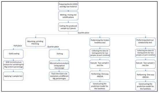 Seven main steps were implemented in processing and preparation of samples in the study. Figure 1 represents a flowchart for a summary of the followed steps. The first step includes sample preparation, which has a sequence of operations including molting, mixing, solidification, mounting, grinding, polishing, and etching. Microstructure analysis was performed using JEOL JSM-7800 F Field Emission SEM with super hybrid lens and Olympus CX22 Optical microscope. The used SEM has five axis stages with up to 200 nA probe current, upper electron detector, lower electron detector, and magnification capability up to 1,000,000×. The Olympus microscope comes with a quadruple nosepiece and 4×, 10×, 40×, and 100× oil objectives focusing plan. One-sample t-test was utilized to examine the Mg content percentile after the solidification process. Vickers hardness test and electrical conductivity were examined by using a WOL PERT 401 MVD with 0.1 μm resolution and 200 μm measuring range and a PCE 20 COM with a measuring range 0.51% to 112% IACS and 0.01 resolution in the third and fourth steps, respectively. After accumulating the data from the tests, a two-sample t-test was performed in the fifth step for each group of the data that were acquired for each sample at the same conditions. In the sixth step, a one-way ANOVA analysis was accomplished for each quality characteristic (hardness and electrical conductivity) to identify the contribution of the controllable parameter (Mg percentile) on each outcome. In the last step, two prediction models were constructed to calculate the hardness and electrical conductivity values as a function of Mg percentile. An efficient software in statistical data analysis and process improvement (Minitab 20) was used to perform all the statistical analysis in this study.