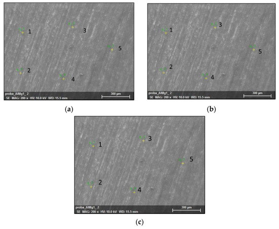 SEM images for Al (1050) alloy at different Mg content percentiles: (a) 1%; (b) 3%; (c) 5%.
