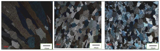 The samples were prepared for microstructure analysis using an optical microscope. Sequential processes (cutting, grinding, polishing, and etching) were implemented for these samples to prepare them for microstructure analysis. The evolutions in grain size for the Al alloy with different percentages of Mg content are examined. Figure 5 displays the changes in the grain size of Al (1050) alloy with different percentages of Mg content (0%, 1%, and 5%). The grain size was significantly decreased with increasing of the Mg content percentile in Al 1050 alloy. According to Figure 5, 60% reduction in grain size of the 1% Mg wt.% content and 80% at 5% Mg wt.% content were observed based on the three sample points that were considered to demonstrate the reduction on the grain size. In addition, the mechanical and electrical properties were directly affected by these evolutions in the grain size. The same observations were concluded by the studies of Ren et al. and Wang et al. In addition, two main precipitate types were formed when Al–Mg alloys were structured. The first precipitate form was (FeMn)Al6, which is hard, insoluble, and brittle. The second type was Mg2Al3, which has a face-centered cubic structure with brittle behavior at room temperature [29,34]. The electrical conductivity is significantly influenced by the microstructure evolutions, where it is strongly dependent on the concentration of atoms in solid solutions. In addition, the dissolved alloying elements in metallic alloys affect the electrical resistivity in an approximately linear relationship, according to Matthiesem’s rule. Moreover, the electrical conductivity is higher at the grain boundaries at which the Mg content is lower, implying a larger grain size compared to the high Mg content. The results are in accordance with the changes influenced by the microstructure evolutions [35].
