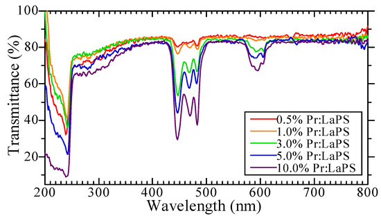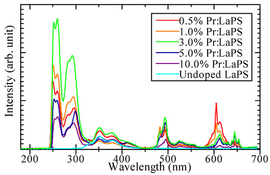 | 0.5% Pr-doped LaPS | 4.64 | 50.6 | 280–310 (5d–4f), 350–400 (STE), 490–500 + 600–660 (4f–4f) | 18.1 | 250–310 (5d–4f), 350–400 (STE), 480–500 + 600–650 (4f–4f) | 26.7, 419.6 | 93 | 1200 |