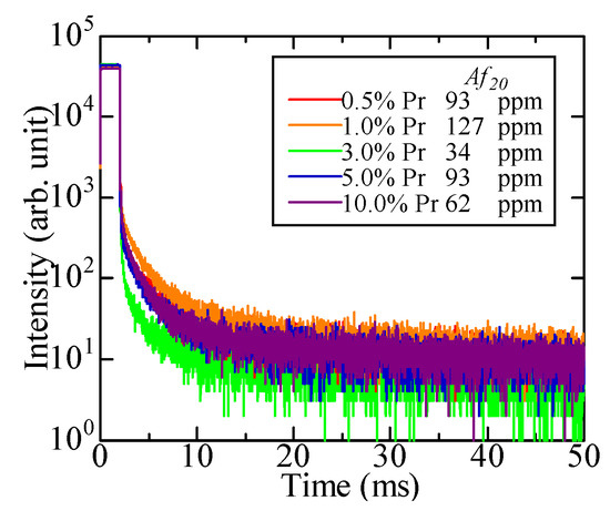 - Nakauchi, D.; Okada, G.; Koshimizu, M.; Yanagida, T. Scintillation and thermally-stimulated luminescence properties of Pr-doped SrAl2O4 single crystals. Radiat. Meas. 2017, 106, 170–174. [Google Scholar] [CrossRef]