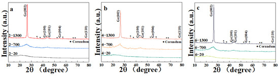 The graphitization process of lignite under high pressure and high temperature can be characterized by X-ray diffraction patterns, as shown in Figure 1. There are metal oxide impurity peaks formed by the sintering of lignite at the high-temperature and high-pressure stage. According to the characteristic peak evolution, the graphitization process under the set pressure conditions can be distinctly viewed as having three regions: the non-graphitization region, the near-graphitization region, and the graphitization region, corresponding to the processing temperatures at 20 °C, 700 °C, and 1300 °C, respectively. In the non-graphitization region, the XRD spectra of samples 2-20, 4-20, and 6-20 are similar to that of raw material, as shown in Figure 1a–c and Figure S1 (in supplementary materials), and all have a relatively weak (002) peak because there is a large amount of disordered structures and amorphous carbons in lignite [29,30], and the elevated pressure seems to have no effect on the structure of the amorphous carbon. In the near-graphitization region, wide diffraction peaks appear in samples 2-700, 4-700, and 6-700 near 25° and 44°, corresponding to (002) band and (10) band of graphite-like, respectively, showing that lignite treated at 700 °C under different high pressures has an aromatic structure stacking growth phenomenon; a cross-lattice structure intermediate in type between the amorphous carbon and the graphite carbon appears, which is referred to as turbostratic carbon [31,32]. It is noted that in the graphitization region, the (002) peak of samples 2-1300, 4-1300, and 6-1300 become high and sharp, and the (10) band splits into (100) and (101) peaks, and (004) and (110) peaks appear, these characteristics indicate that the lignite crystallizes under high temperature–high pressure, and the three-dimensional structure of graphite mainly appears based on the 2H phase [10,13]. XRD patterns of samples 2-1300, 4-1300, and 6-1300 were indexed to be the hexagonal structure with the space group of P63/mmc (No. 194). The calculation of the three samples’ unit lattice parameters was performed by Rietveld refinement, which was 2.4673~2.4641 Å, the c was 6.7662~6.7363 Å, and the lattice volume was 35.67~35.42 Å3 (Table 1).