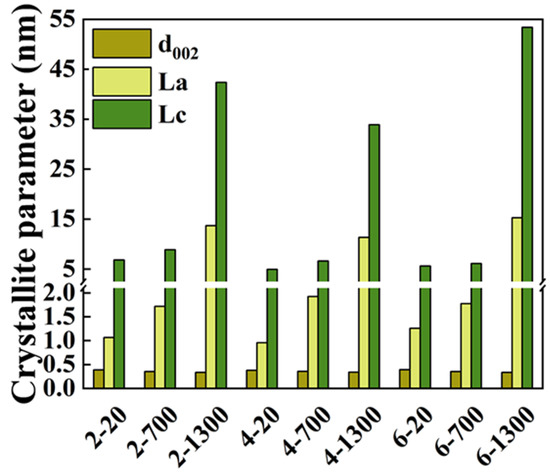 In order to deeply understand the changes to the lignite microcrystalline structure, the crystallite lattice parameters (interlayer spacing (d002), stack height (Lc), stack width (La), the average number of aromatic layer per crystallite (Nave), aromaticity (fa), and La/Lc) were calculated using the Bragg’s equations and empirical equations derived from the Scherrer formula, and La/Lc reflected the morphological characteristics of aromatic structures (Equations (S1)–(S5)) [12,35,36,38]. The Mering–Maire formula was used to calculate the degree of graphitization (G) of sample (Equation (S6)) [11]. As seen in Table 2 and Figure 2, the crystallite lattice parameters show obvious stage evolution characteristics with the change of temperature. At 6 GPa, d002 decreases continuously from 0.3519 to 0.3361 nm with an increasing sintering temperature from 20 to 1300 °C, which indicates that the high temperature can effectively reduce the layer spacing of aromatic layers. It is noteworthy that the d002 of the lignite sample acquired at 6 GPa and 1300 °C approaches that of pure graphite (0.336–0.337 nm), superior to that of pyrolysis graphite (0.3508–0.3615 nm) [29,39], which indicates that the high pressure can induce high-quality graphite from low-level coal. The d002 shows a similar trend at different pressures: d002 decreases from 0.3517 to 0.3368 nm at 2 GPa, and varies from 0.3519 to 0.3381 nm at 4 GPa. According to the International Committee for Coal and Organic Petrology (ICCP) classification for anthracite, meta-anthracite, semi-graphite, and graphite [40], the anthracite has d002 > 0.340 nm. The meta-anthracite is classified by d002 within the range of 0.338–0.340 nm, and semi-graphite is defined by d002 within the range of 0.337–0.338 nm. The d002 of 0.3354–0.337 nm represents the graphite zone. The d002 of samples 2-700, 4-700, and 6-700 is 0.3400, 0.3452, and 0.3382 nm, indicating that samples 2-700 and 6-700 are within the meta-anthracite range, while sample 4-700 belongs to the anthracite zone. As the temperature rises to 1300 °C, sample 4-1300 just falls into the meta-anthracite area, but samples 2-1300 and 6-1300 both belong to the graphite category. For the graphite samples, in order to evaluate the degree of ordering of the crystalline structure, the asymmetry index (AI) of (002) reflection is proposed based on the concept for the asymmetry index of (001) reflection of illite used for evaluating its degree of crystallinity [34]. Figure S3 shows that the AI of (002) reflection of samples 2-1300, 4-1300, and 6-1300 is calculated using left FWHM divided by right FWHM, due to the asymmetric nature of (002) reflection caused by the turbostratic structure and structure defect in the crystalline structure. In general, the high AI value can be used to reflect a more symmetric (002) reflection of coal-derived natural graphite, which indicates a high degree of ordering of the crystalline structure. Surprisingly, sample 4-1300 has the highest AI value compared with samples 2-1300 and 6-1300, while the d002 of sample 4-1300 is higher than that of samples 2-1300 and 6-1300, which is probably caused by the residual aliphatic side chains between the aromatic rings in highly ordered sample 4-1300. It is noteworthy that the range of AI > 0.63 can be used to assess highly ordered coal-derived natural graphite: samples 2-1300 and 6-1300 can rival most natural graphite in terms of structural order, and sample 4-1300 possesses a higher degree of ordering of graphite lamellae in a lateral direction than that of most natural graphite, as shown in Table S2. From the above analysis, we can conclude that the high pressure is in favor of eliminating dislocation in the stacking and in-plane defects of flat aromatic layers, further resulting in highly ordered graphite.