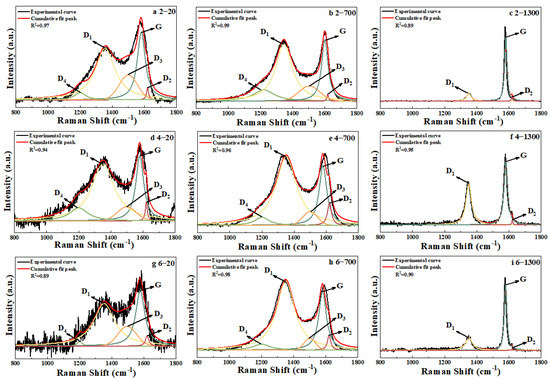 Assignments of curve-fitted bands for first-order Raman spectra in case of samples (a) 2-20, (b) 2-700, (c) 2-1300, (d) 4-20, (e) 4-700, (f) 4-1300, (g) 6-20, (h) 6-700, and (i) 6-1300.