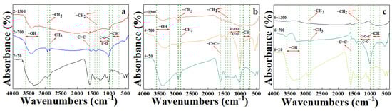 FTIR spectra of lignite samples prepared at high pressure of (a) 2 GPa, (b) 4 GPa, and (c) 6 GPa.