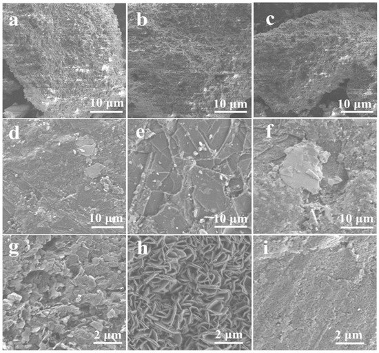 SEM images of samples (a) 2-20, (b) 4-20, (c) 6-20, (d) 2-700, (e) 4-700, (f) 6-700, (g) 2-1300, (h) 4-1300, and (i) 6-1300.