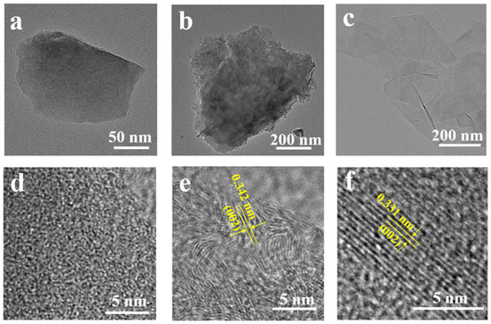 TEM and HRTEM micrographs of lignite samples at different temperatures of 2 GPa: (a,d) 20 °C, (b,e) 700 °C, and (c,f) 1300 °C.