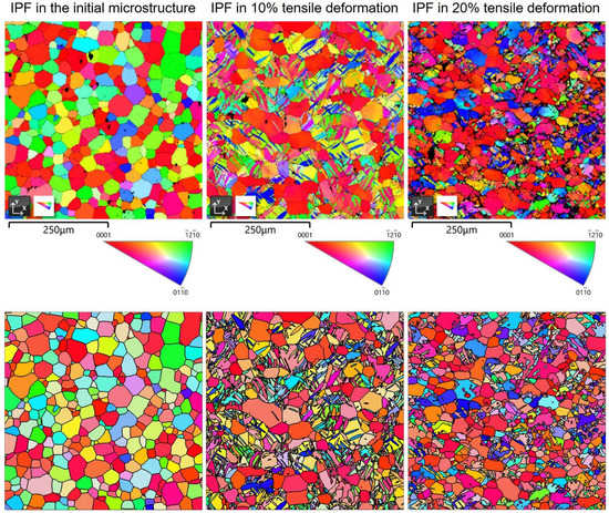 Inverse pole figures of microstructure under 2%, 6%, and 10% tensile deformation.