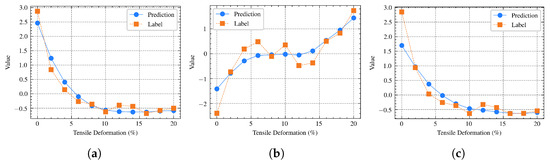 As shown in Figure 5, the results of our proposed method in a best fit regression line most closely approximate the Label–Prediction curves. The second is the best fit regression line of the results obtained by the HGGAT method. Other models have different effects on different indicators. In general, except for the method proposed by us, the prediction results of other models all have large deviation. The prediction result of the CNN model is poor, precisely because the CNN model only learned the image features of the inverse pole figure map, and did not understand the structural relationship features of the microstructure presented by the EBSD scanning data.