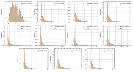 As shown in Figure 6, the PCA (Principal Component Analysis) method was used to reduce the dimensions of the grain morphology features extracted from the trained autoencoder to obtain the one-dimensional distribution of grain morphology features. The morphology features distribution after dimensionality reduction was compared with the grain size distribution of EBSD scanning data. Figure 6 clearly shows that the two distributions are similar. This result indicates that the proposed autoencoder can extract the grain features effectively, and the extracted features can reflect the original size, shape and other physical information of the grain to a certain extent.