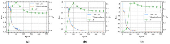 The model was trained in training rounds, and the loss curve of the three indicators is shown in Figure 7. It can be seen that our proposed method can achieve convergence after limited epochs of training. In the training of the three indexes, the declining trend of loss became slow after 100 epochs of training. After 300 epochs of training, the training loss of the model tended to be stable. From the performance of the model in the test set, the model after 100 epochs of training can achieve better results. This is because the increase in training epochs leads to the over-fitting of the model, which leads to the deterioration of the prediction effect of the model on the test set. Even though the model after 300 epochs of training had a lower loss on the training set, the generalization of the model became worse.