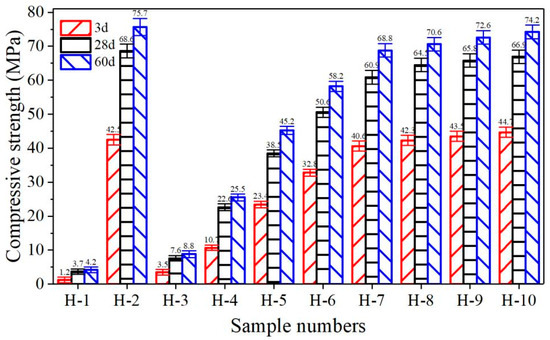 When the content of GPS increased to 20% (sample H-4), the compressive strength of specimens cured for 3 d increased to 10.7 MPa, which further increased to 22.6 and 25.5 MPa when curing was prolonged to 28 and 60 d, respectively. With the increase in GPS content, the growth rate of compressive strength in sample H-4 began to increase significantly. In addition, with the increase in GPS content, the growth rate of compressive strength in samples H-5 and H-6 was still obvious. Before reaching the GPS content of 50%, the compressive strength of sample H-7 cured for 3 d increased to 40.6 MPa, which further increased to 60.9 and 68.8 MPa when curing for 28 and 60 d, respectively; it was only 4.5%, 11.2%, and 10% lower than sample H-2 (100% GPS) for the corresponding curing ages. It indicates that increasing the GPS amount improves active silicon and aluminum in the mix and makes the excess active calcium continue to polymerize with active silicon and aluminum; it increases the polymerization rate and improves the formation of high-strength polymer products to achieve the goal of improved mechanical strength [26].