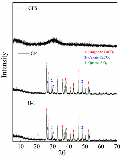 The XRD analysis of samples H-3, H-7, and H-10 is shown in Figure 3. When 10% GPS was added, the XRD pattern of sample H-3 changed significantly. First, compared with sample H-1, the intensities of aragonite characteristic peaks at 26.2°, 27.2°, 33.1°and 36.2° in sample H-3 are reduced. Moreover, the intensities of calcite characteristic peak at 29.4°and quartz characteristic peak at 26.6°also shows a certain degree of reduction, which shows that the contents of aragonite, calcite, and quartz in sample H-3 are reduced to a certain extent. This is because the incorporation of GPS promotes the synergistic enhancement effect of CP, enhances the polymerization activity of inert calcium in CP, and promotes the formation of polymerization products between calcium and active silicon and aluminum, resulting in the decline of characteristic peaks of aragonite, calcite, and quartz [29].