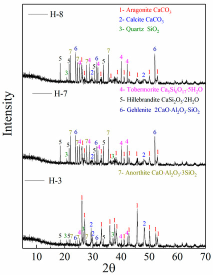 When the content of GPS exceeds 50%, the effects of the improvement and activation of CP become less obvious. When the GPS content increases to 60%, although the characteristic peaks of aragonite at 27.2°, 33.1°, 41.2° and 52.4° in sample H-8 (Figure 3) still decrease to a certain extent, the decreasing range is significantly reduced compared with sample H-7. It confirms that the enhancement effect has been significantly reduced. The characteristic peaks of tobermorite (near 40°), hillebrandite (21.6°), and gehlenite (31.4° and 52.2°) in sample H-8 are only slightly enhanced. However, the characteristic peaks of the above minerals from other angles did not increase any more compared with sample H-7. This shows that increasing the GPS content based on 50% cannot significantly improve the formation of calcium silicate and calcium aluminosilicate minerals, which is also the reason for the significant decrease in the compressive strength development rate of sample H-8.