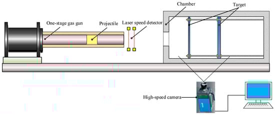 The experiment system was mainly composed of the one-stage gas gun, laser speed detector, chamber, double-spaced Al plates holder, and high-speed camera, as shown in Figure 1. After the projectiles were launched by the one-stage gas gun, the two laser beams (laser speed detector) recorded the speed of the projectiles. An on–off signal, produced by the veil effect of the projectiles on the laser beams, was used to trigger a high-speed camera; consequently, the images of the penetration and deflagration behavior of the RMPs on the double-spaced Al plates was recorded. Eight shots, with the impact velocity ranging from 293 to 652 m/s, were performed to investigate the penetration and deflagration behavior of RMs. Several square Al plates with a size of 400 × 400 mm2 were used in this study and the distance between the front and rear plate was 200 mm. The size of the projectiles is listed in Figure 1. The penetration hole and bulges on the front plate (FP) and rear plate (RP) were used to characterize the penetration behaviors of RMPs and damage effects of the double-spaced Al plates, while the duration and size of the flame, resolved by high-speed camera, were used to characterize the deflagration behavior of RMPs.