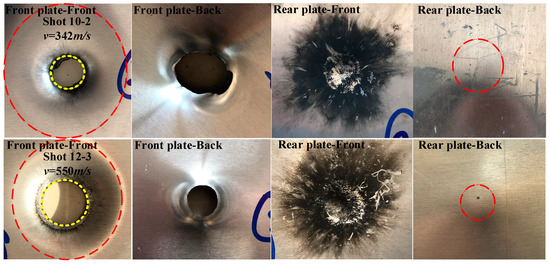 In the eight experiments with velocities ranging from 293 to 652 m/s, all front plates were perforated, while petalling or plugging damage formed on the backside of the front plates, depending on the various impact velocities. It is worth noting that there was a plastic zone (between the red and yellow dotted line in Figure 2) in the vicinity of the penetration hole in both petalling and plugging damage. On the rear plates, considerable soot was produced on the frontside because of the chemical reaction by residual RMPs, while various degrees of bulges were formed on the backside. The typical damage patterns and details on damage effects are shown in Figure 2 and Table 1, respectively.