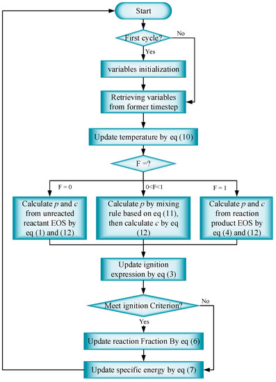 When called by the main program, the EOS subroutine checks whether the current cycle is the first cycle. If so, it initializes user-defined variables to zero, else it retrieves variable values from the previous timestep. Then, it estimates the temperature using Equation (10) so the pressure can be calculated with corresponding EOS models. Meanwhile, the local sound speed of a small region is estimated using Equation (12). Afterward, it updates ignition expression on the left side of Equation (3) using the pressure calculated in the current timestep. If this meets the ignition criterion, it updates the reaction fraction in Equation (6), else it implies the chemical reaction does not occur in this small region. Finally, it updates the specific energy using the new reaction ratio.
