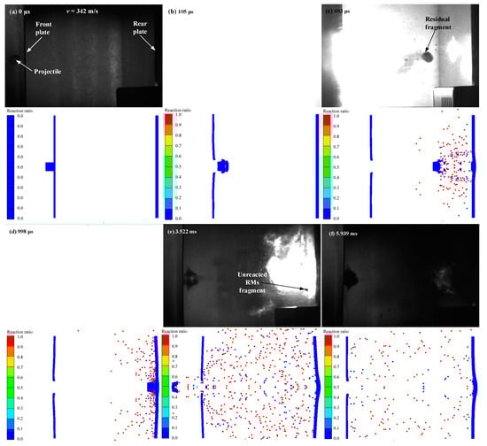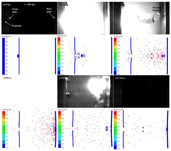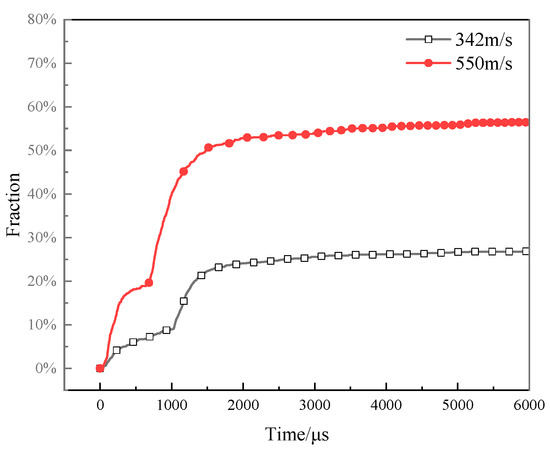 The time-resolved reaction ratio of an RMP with an impact velocity of 342 and 550 m/s is shown in Figure 10. As analyzed above, the deflagration starts when the indicator of ignition constant reaches the preset value. After perforating the front plate, the reaction ratio of RMPs increases remarkably. Then, however, there is an approximate flat in the curve of the reaction ratio of RMPs, which implies the flameout of overall deflagration. This simulation result can be verified by the sharp decay of fire light in the experiments, and it does not greatly change until the residual RM fragments impact the rear plate. Then, partial RMs ignite at the second impact and the reaction ratio increases to a new level. It can be also seen from the pictures that the deflagration quantity after impact on the front and rear plate is dependent on impact velocity. When the impact velocity is 340 m/s, the deflagration quantity after impact on the front plate is less than 550 m/s (the reaction ratio rises to 9% for 340 m/s while 19% for 550 m/s). The indicator of ignition constants of uninitiated RMs accumulated during the first impact, so the impact on the rear plate induces more RMs to be deflagrated. The final reaction ratio increases with the impact velocity, but neither their final reaction ratio nor reaction efficiency reaches one, indicating that partial RMs in the RMP fail to ignite under current impact conditions.