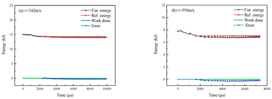 The characteristics of fire light, such as appearance time, intensity, size, and so on, are closely related to the ignition and reaction ratio of RMPs. However, because of the shielding effect of fire light and insufficient testing methods at present, it is extremely difficult to study the ignition and relevant reaction mechanisms of RMPs in a high-velocity impact event. Based on this consideration, the numerical simulation method was developed to reproduce the impact-induced deflagration behavior using computer codes. An EOS with tunable ignition threshold was written in Autodyn codes for RMs, and simulations were carried out under the same conditions as the impact experiments, the results of which are shown in Figure 5 and Figure 6. In the pictures, the scale represents the reaction ratio (ALPHA) of every particle included in the simulation model. In this way, the ignition behavior, time-resolved reaction ratio, and temperature distribution of RMPs were obtained. The energy and error time histories are illustrated in Figure 7, which indicates the energy balance at a good level, and the simulation results discussed in detail in the following part is reasonable.