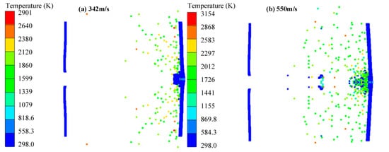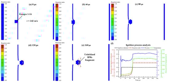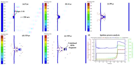 Figure 8 and Figure 9 illustrate the typical ignition process of RMs at 160 μs after impact. When impacting the plate at 342 m/s, the ignition occurs at the strongest shear zone between the edge of the RMP and Al plate immediately after impact (Figure 8b). Then more RMs are activated to deflagration on the fracture surface (Figure 8d). It is interesting to note that the front side of the RMP fails to ignite, though it suffers the maximum pressure during the impact event, resulting in a cone of uninitiated RM fragments flying toward the rear plate. This phenomenon confirms that the ignition mechanisms of RMs are more likely to be attributed to shear instead of pressure, because the ignition result in this simulation is well consistent with the experiment result by Raftenberg [34]. When the impact velocity is enhanced to 550 m/s, more RMs are activated as a result of stronger shear effects between the edge of the RMP and plate (Figure 9d). Nevertheless, several RM fragments still fail to ignite (Figure 9e).