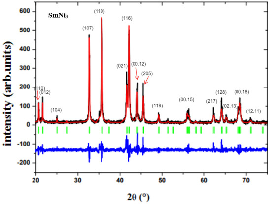 The Rietveld refinement pattern of SmNi compound XRD. The red and black lines present, respectively, the calculated intensities and the experimental intensities. The green vertical bars correspond to () line positions (positions of Bragg peaks). The blue line shows the difference between the calculated and experimental intensities.
